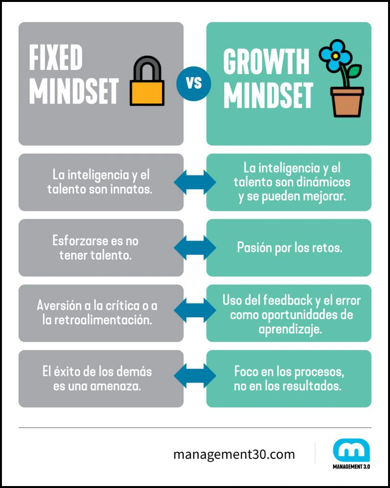 Pero esto va un poco más allá, ya que una persona con mentalidad fija no está abierta para aprender en todo el sentido de la palabra, no solo me refiero a buscar aprender nuevas cosas (como tomar cursos o formar parte de institutos), esto implica también que suele evitar retos o teme equivocarse y se va por realizar actividades “a la segura” (en las que no puede equivocarse), lo cual le evitar el aprender y desarrollar nuevas habilidades. Esto tiene también que ver con que, por ejemplo, pueden tomar una retroalimentación o feedback como una invalidación personal, con frustración, actuando a la defensiva y poniendo la responsabilidad en los demás en lugar de en sí misma o en sí mismo, ya que no está abierta para aprender y esto incluye el negarse a identificar áreas de mejora en su persona.