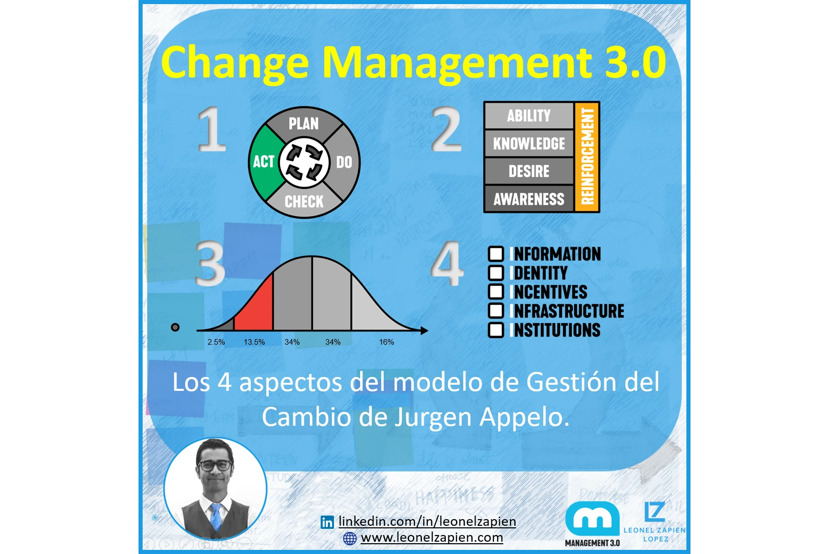 El modelo de Gestión de Cambio de Management 3.0, que es parte del kit de herramientas de Management 3.0, propone 4 aspectos: