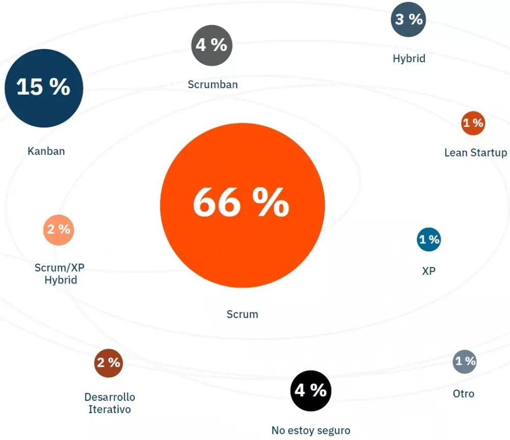 De acuerdo con el estudio Agile Adoption Reporte 2020 de CertiProf realizado a más de 80,000 profesionales ubicados en América del Sur y del Norte, España, África y Asia sobre la agilidad, el 66% de los encuestados están familiarizados o trabajan con Scrum, después le siguen Kanban con el 15%, y el resto está distribuido en porcentajes mejores 4%, por lo que la popularidad de Scrum es, con mucho, predominante, tal como se puede observar en la siguiente imagen.